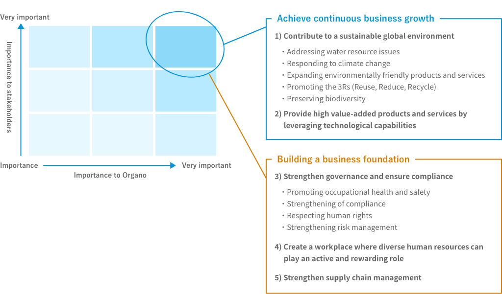 - Materiality candidates extracted are organized according to the ORGANO2030 framework of achieving continuous business growth and building a business foundation, and evaluated from the perspective of their importance to the Company. These include relationships with stakeholders, risks and opportunities, the value of the Company’s products and services, and contribution to social issues. Then material issues (materialities) are preliminarily selected.