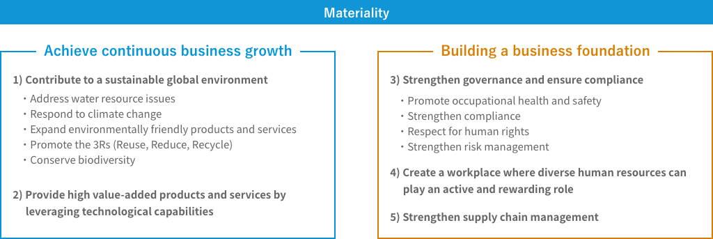 Our materiality consists of five elements: two related to achieving continuous business growth, and three related to building a business foundation. The former is related to global environmental conservation and value creation through business activities, which are essential for daily life, industry, and business. The latter is the basis for continuous business operations while fulfilling social responsibilities. We believe that comprehensively addressing these issues will lead to the implementation of our long-term management vision.