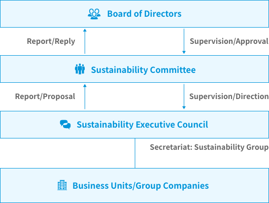 In December 2021, the Group established the Sustainability Committee as an organization to plan, formulate, and implement measures to promote sustainability management. In addition, we have established the Sustainability Executive Council, which is responsible for the implementation of specific measures. The Sustainability Committee reports and advises the Board of Directors on the progress and achievement of matters discussed and reviewed by the Committee.