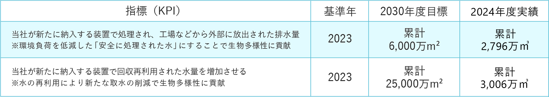 当社はオルガノグループ企業行動指針の中で、生物多様性の保全と自然保護に貢献する取り組みを積極的に行うことを明示しております。 水は生命の源です。地球上を循環し、さまざまな動植物を育んでいます。その水を守ることは命を守ることにつながります。 当社は水環境への負荷を軽減する排水処理技術や水の再利用を促進する水回収技術を開発し、製品やサービスの提供を通じて生物多様性の保全に取り組んでまいります。 その取り組みを当社の重要課題(マテリアリティ)と特定し、指標(KPI)を設定しています。 指標(KPI)を推進することにより生物多様性に寄与してまいります。